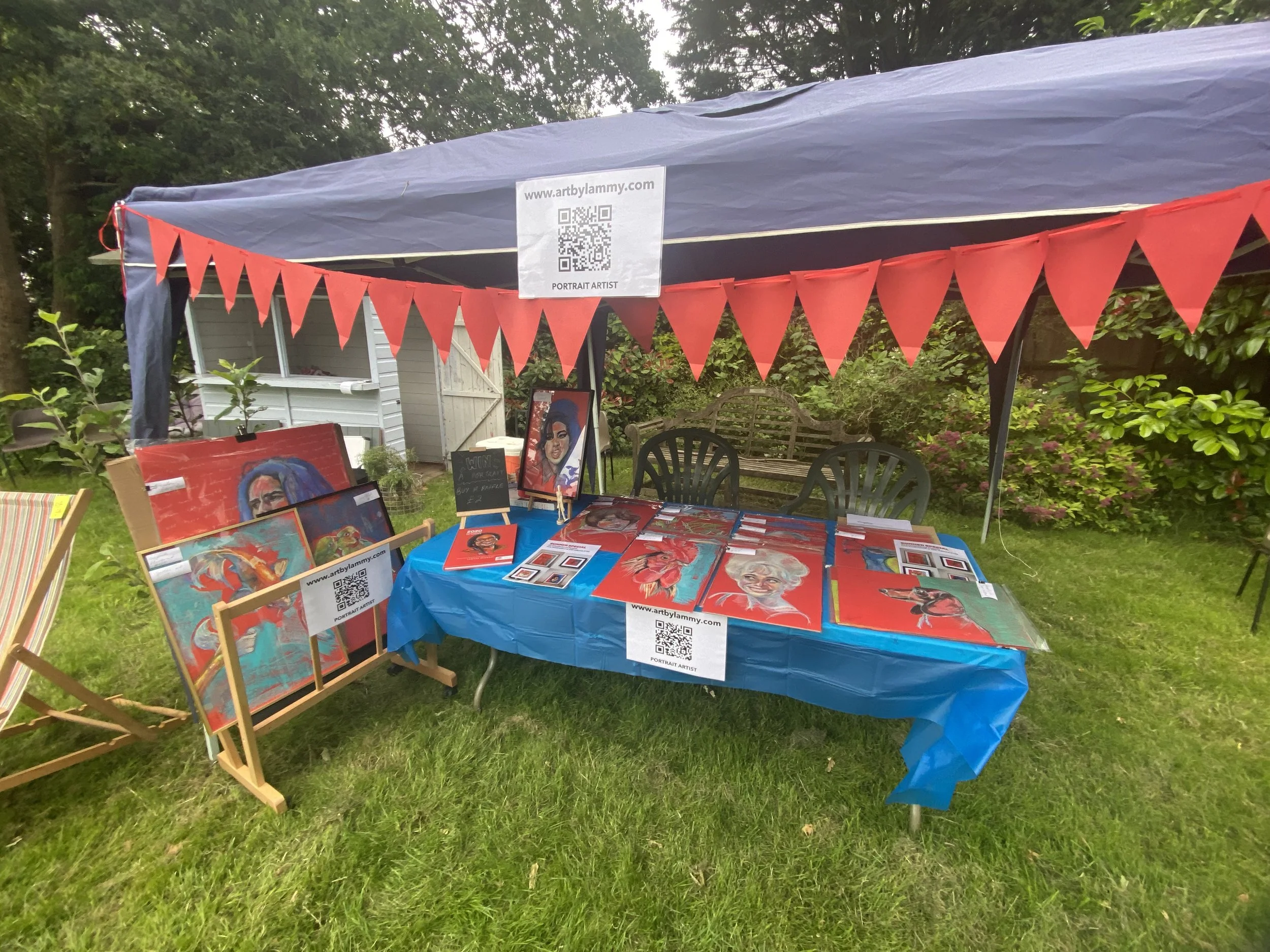 Presented a selection of original portrait works at a community pop-up exhibition during the St John the Baptist Summer Fayre. The event included original artworks for sale and a raffle offering a custom portrait commission to local winner.